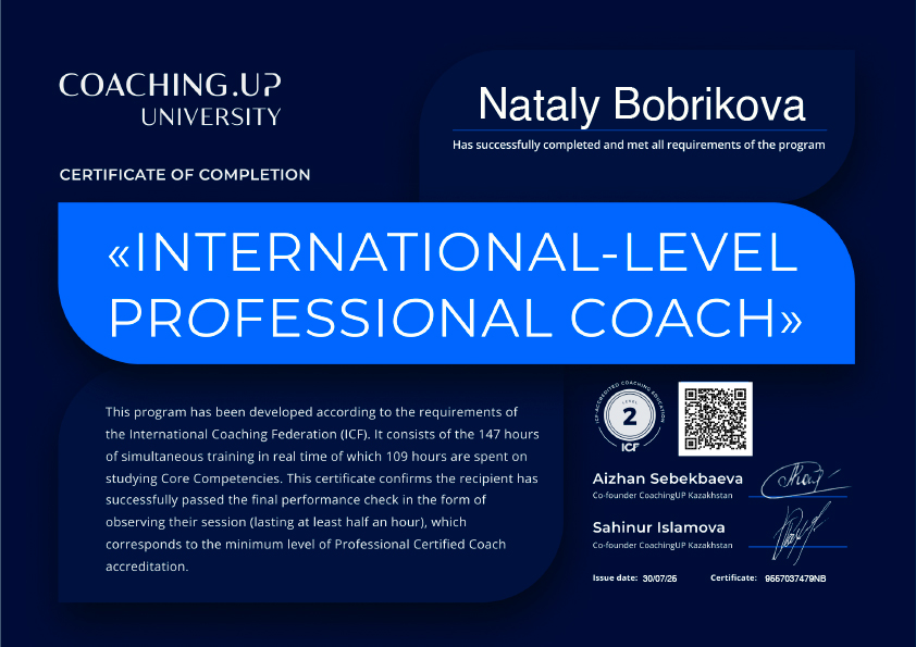 Коучинг расширил мое мировосприятие, поменял отношение к себе и к миру, дал ощущение собственной силы. Применяя навыки коуча в повседневной жизни, я поняла, что я не одна, я есть у себя, я есть для себя, и я могу себе помочь справиться с трудностями, улучшились мои взаимоотношения с мужем и с окружающими меня людьми. Я знаю где брать силы и как поддерживать себя в трудную минуту. Я научилась лучше понимать, слушать, слышать, и, самое главное, принимать себя. Я шла за новой профессией, а получила новую себя, более понимающую, более легкую, более настоящую. И сейчас я испытываю искреннюю благодарность по отношению к своему ребенку за тот путь, что мы с ним прошли и который сделал нас сильнее, мудрее и ближе друг к другу. За тех людей, что мы повстречали на нашем пути, за те уроки, что мы с ним получили, и, конечно же, за школу коучинга Coaching Up! Каждому преподавателю, каждому ментору, каждому коллеге с которым мне посчастливилось поработать или поучиться я говорю больше искреннее спасибо! За то пространство и атмосферу искренности, которое вы создаете, за тех нас настоящих, которых мы раскрываем в процессе обучения, за ту магию, которую мы творим, раскрывая себя!