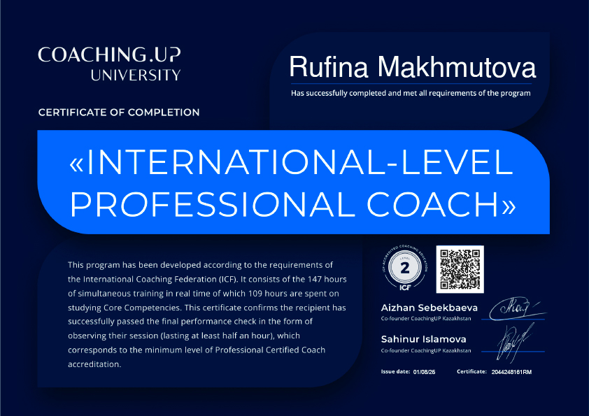Хорошо развился навык коммуникации, научилась не только проводить сессии, но и научилась быть открытой, общительной. Получила сертификат Level 2, сейчас развиваю себя как коуча и понемногу начинаю на этом зарабатывать.